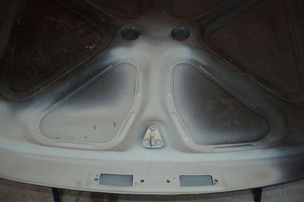 First, the trunk was scrubbed down to solid surface or metal, and spot primed. The single-stage paint was supplied by the body shop who will shoot the body in 2-stage. I certainly paid a premium to do it that way, but now I can hold them accountable for matching when the time comes.