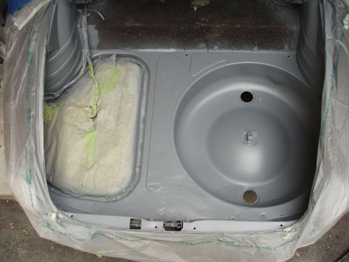 Paint is being applied! The engine bay, the trunk, and all four wheel wells of the Duetto have been painted. We started with the trunk, which was not media blasted. That necessitated a bit of prepwork.